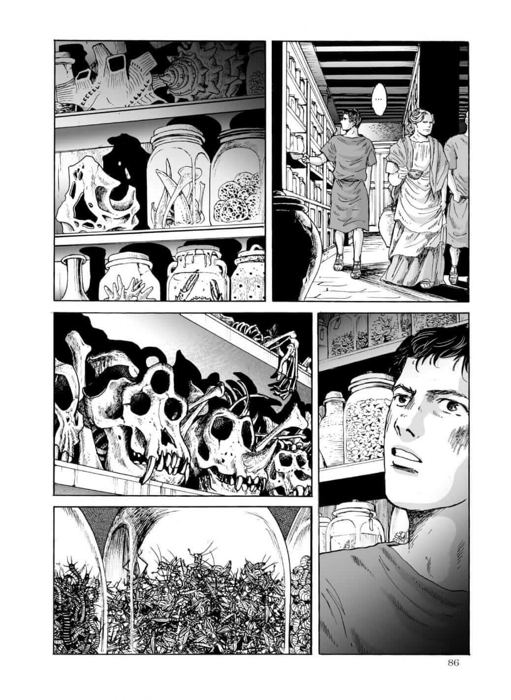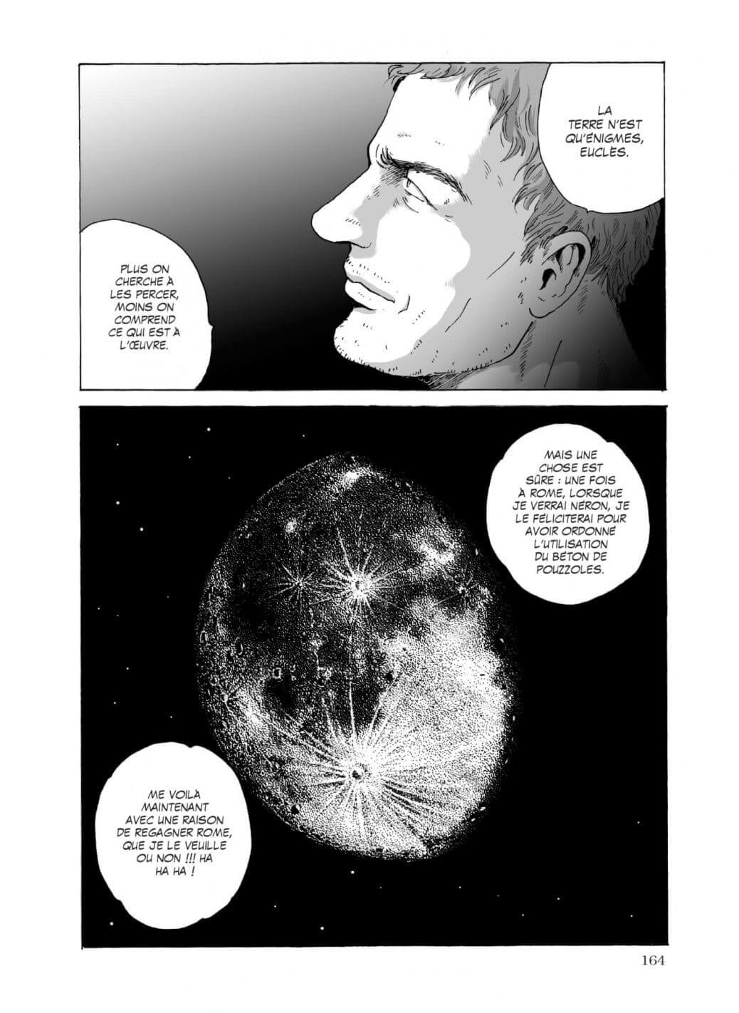 Le manga s’ouvre sur les deux scènes qui vont délimiter le récit, à savoir l’éruption du Vésuve en 79 de notre ère et celle du Vésuve 20 ans plus tôt, où il rencontra son scribe et ami, Euclès, qui sera notre narrateur. Le tome 1 nous présente la rencontre des deux personnages principaux que sont Euclès et Pline d’une manière un peu poussive, c’est dommage, mais il faut surement ça pour nous permettre d’entrer dans le récit et de comprendre quel Homme important sera Pline. Heureusement, le tome 2, avec l’arrivée de nos acolytes à Rome corrige le tir avec son lot d’intrigues et l’apparition de personnages historique tels que Néron et Poppée. Vous le savez sans doute déjà, mais Pline est manga qui se veut plus contemplatif qu’autre chose. Vous allez admirez les dessins, suivre l’évolution de Pline et son secrétaire Euclès, découvrir des choses et prendre part aux intrigues qui se tissent peu à peu, mais il n’y a pas d’action (sauf peut-être les scènes de tremblement de terre !) mais que c’est bon. C’est une vraie aventure et je pense que vous devriez y jeter un œil.